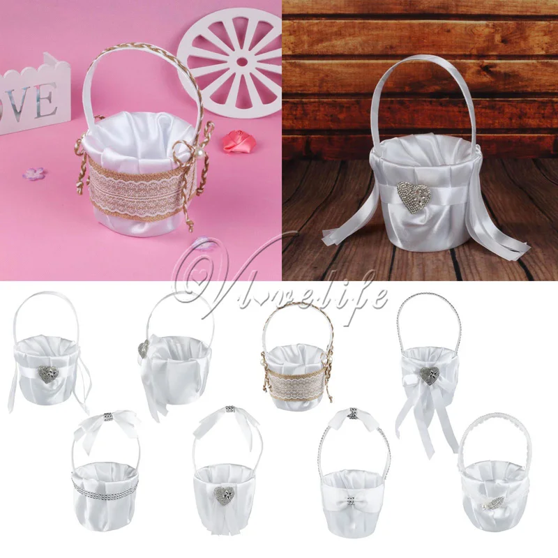 cheap buy White Wedding Decorations Girl Flower Basket with Satin Ribbons Bowknot Heart Shape Rhinestone Party Favors Decor 14X23 CM cheap