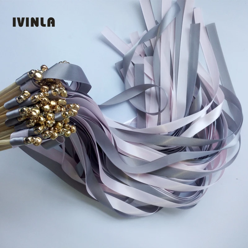 good Definitely the 50pcs lot pink and grey wedding wands stick with gold bell ribbon Twirling Streamers for wedding decoration cheap