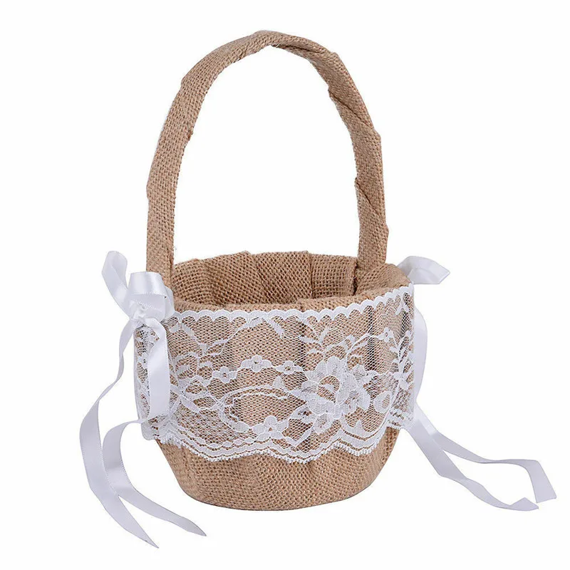 cheap buy Vintage Burlap Basket Lace Bow Flower Girl Basket Wedding Party Decor cheap